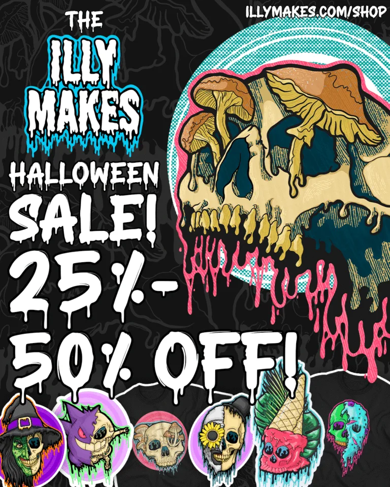 I don’t typically write blog posts like this, but itβs spooky season, and the drippiest deals of the year have officially risen from the grave! From now through October 31, you can score massive savings on all your favorite Illymakes art, merch, and more.