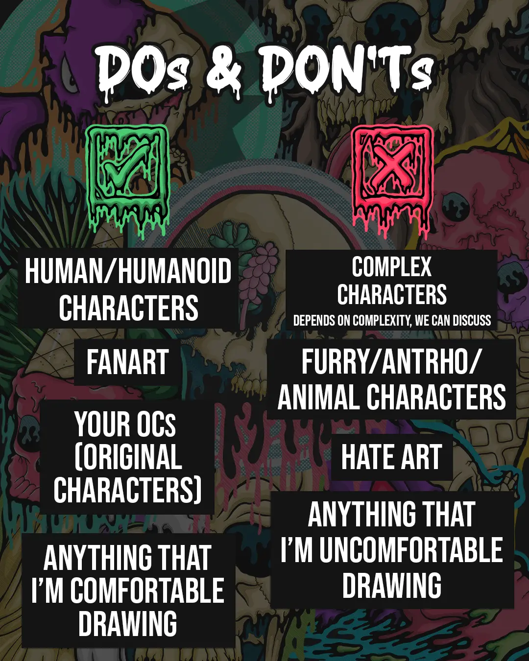 Just send me a message on my socials (Instagram DMs, TikTok DMs, Ko-fi messages, Patreon messages, or email). Include the option you want + any character references.