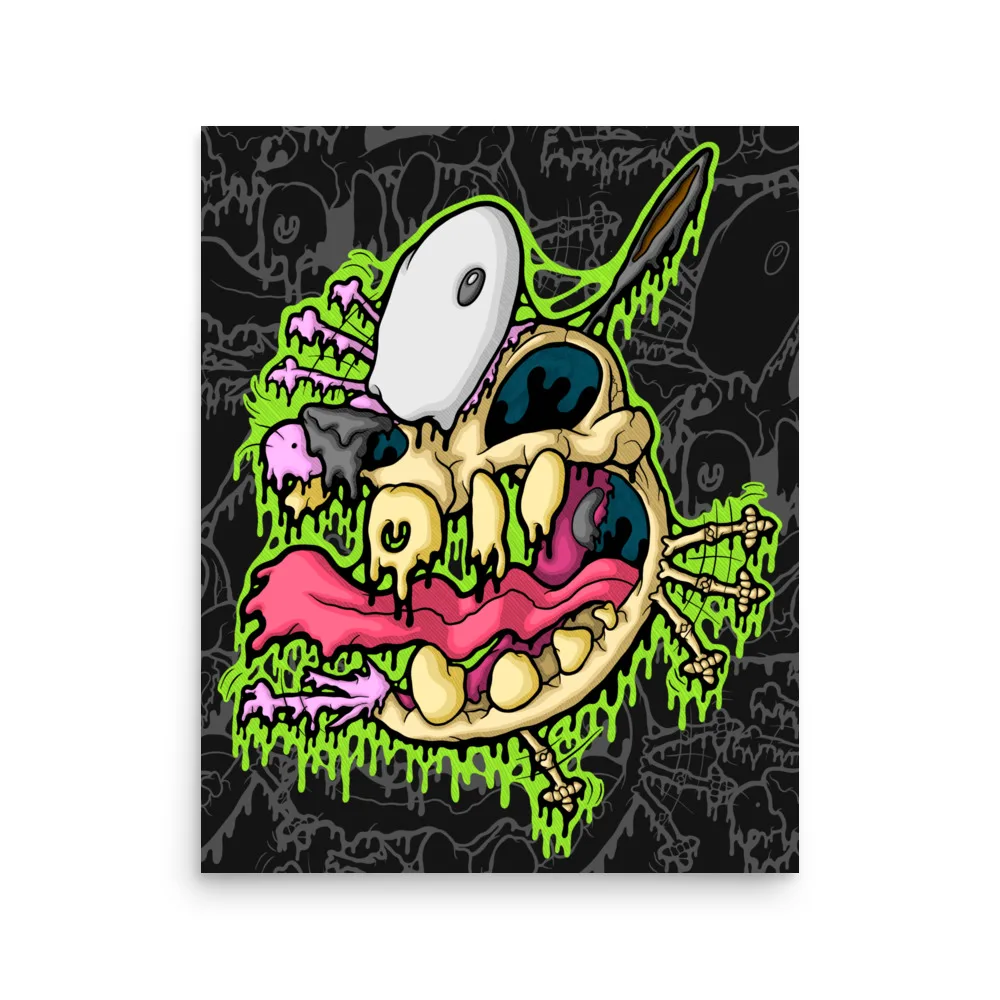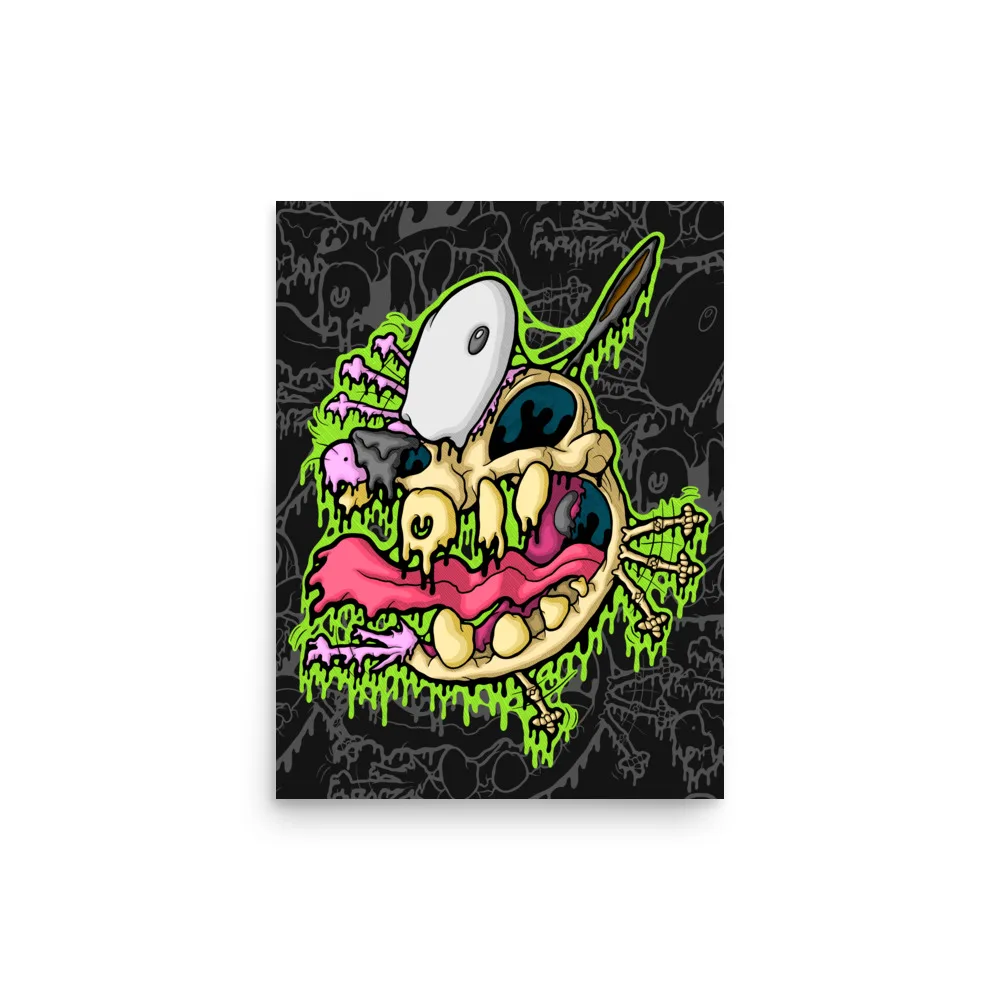 Museum-quality matte print featuring the original Illymakes Drippy Courage Skeleton artwork in vibrant neon detail.