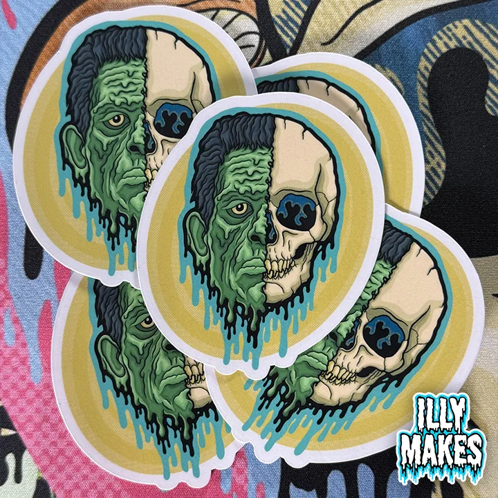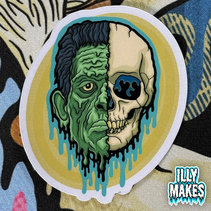 Bring a monster classic to life with the Drippy Frankenstein Skull Sticker. This original artwork by illymakes fuses horror iconography with a skeletal twist, featuring a half-decayed green face transforming into a skull with dripping neon accents. Bold, eerie, and unforgettable, this design is perfect for horror fans, monster lovers, and anyone who wants their stickers to have a spooky edge.