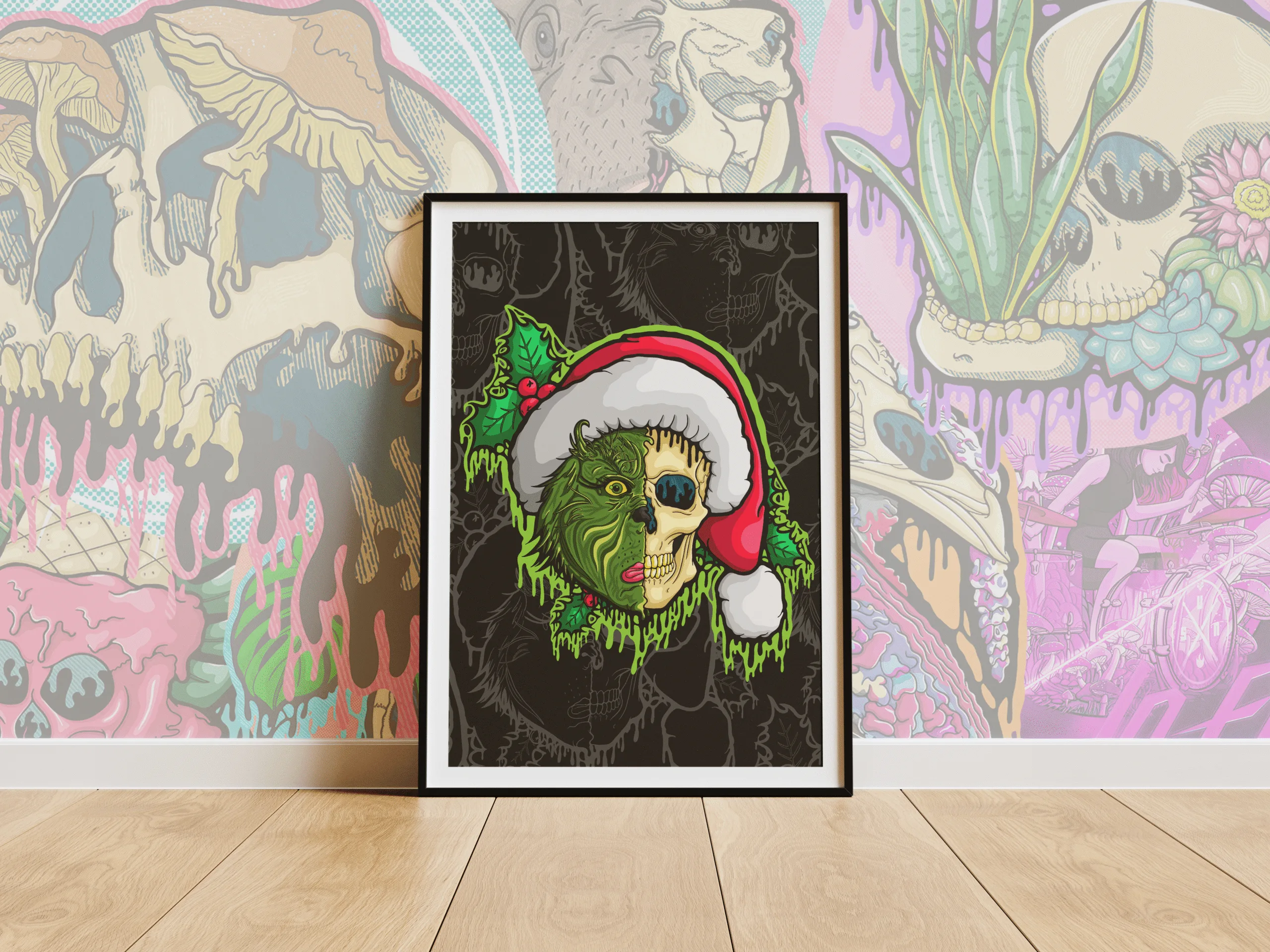Make your holidays a little creepier with the Drippy Grinch Skull print. This artwork reimagines a holiday classic in my signature drippy skull style—half Grinch, half skull, all attitude. With a Santa hat, dripping textures, and holly accents, this design blends festive cheer with macabre surrealism for a truly unique seasonal vibe.
