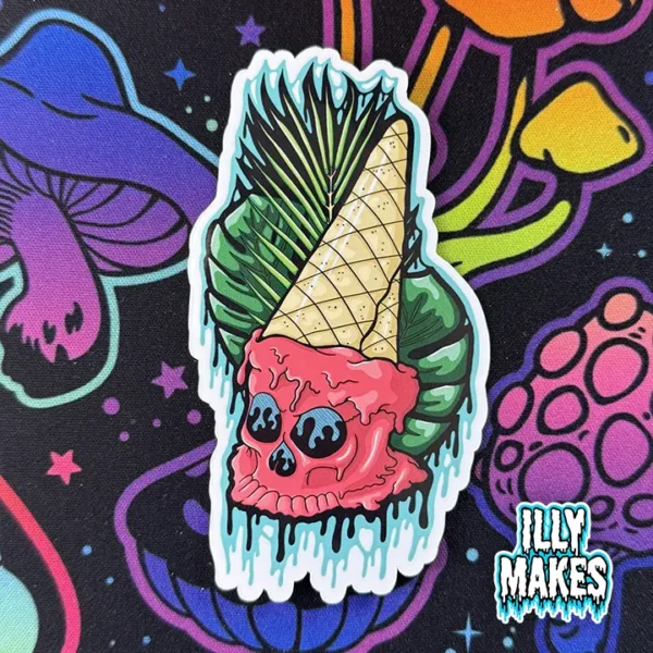 Cool off with the Drippy Ice Cream Skull Sticker, a gothic decal featuring creepy drippy skull art. Great for horror fans, collectors, and alternative sticker lovers with a sweet side.