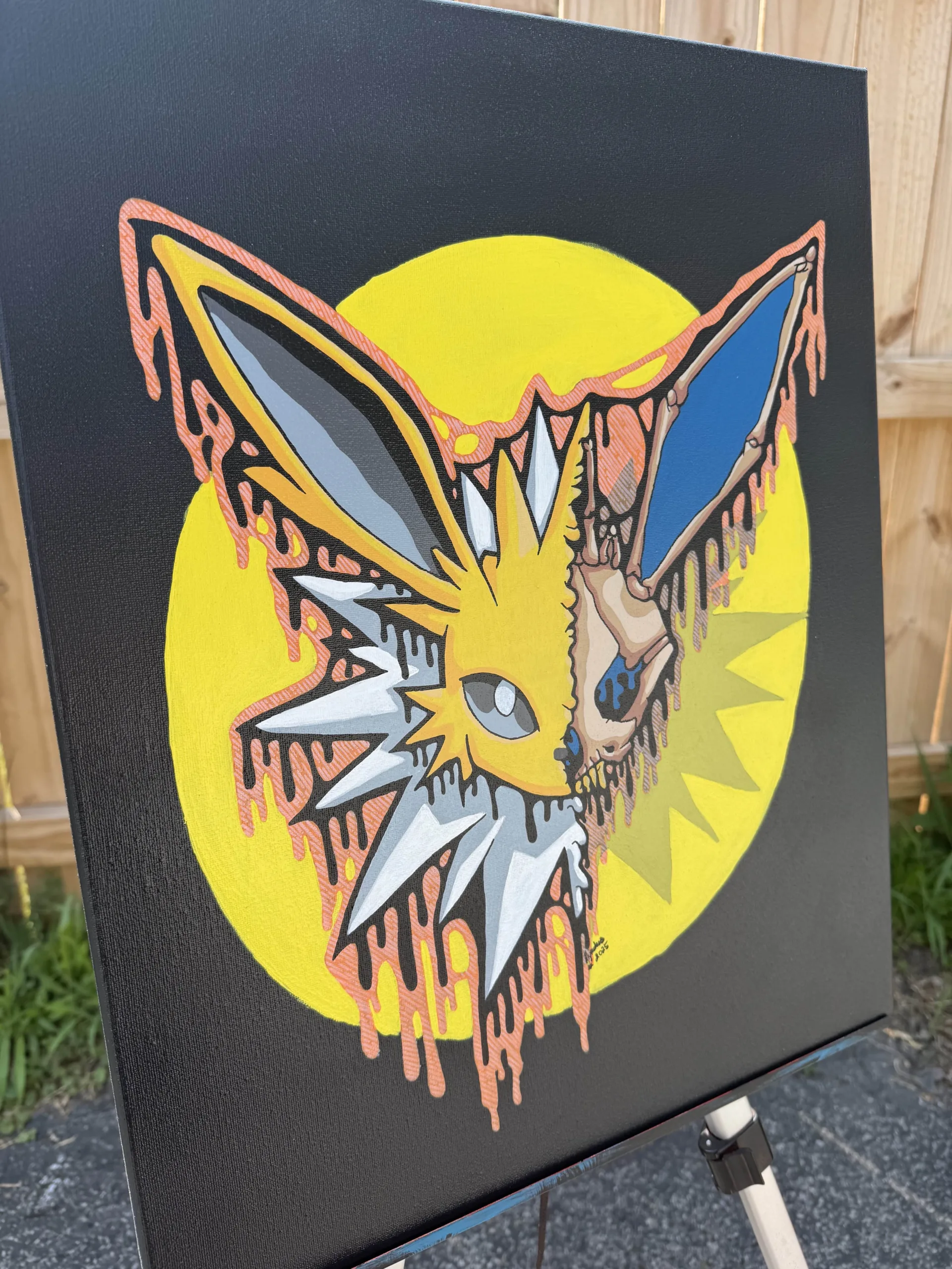 Shock your walls with high-voltage art in this Drippy Jolteon Skull acrylic painting. Measuring 20×16 inches, this one-of-a-kind piece reimagines the electric Pokémon in my signature drippy skull style. Jolteon’s spiky yellow fur and piercing features crackle with energy, while skeletal details drip into neon textures, set against a bold yellow circular backdrop.