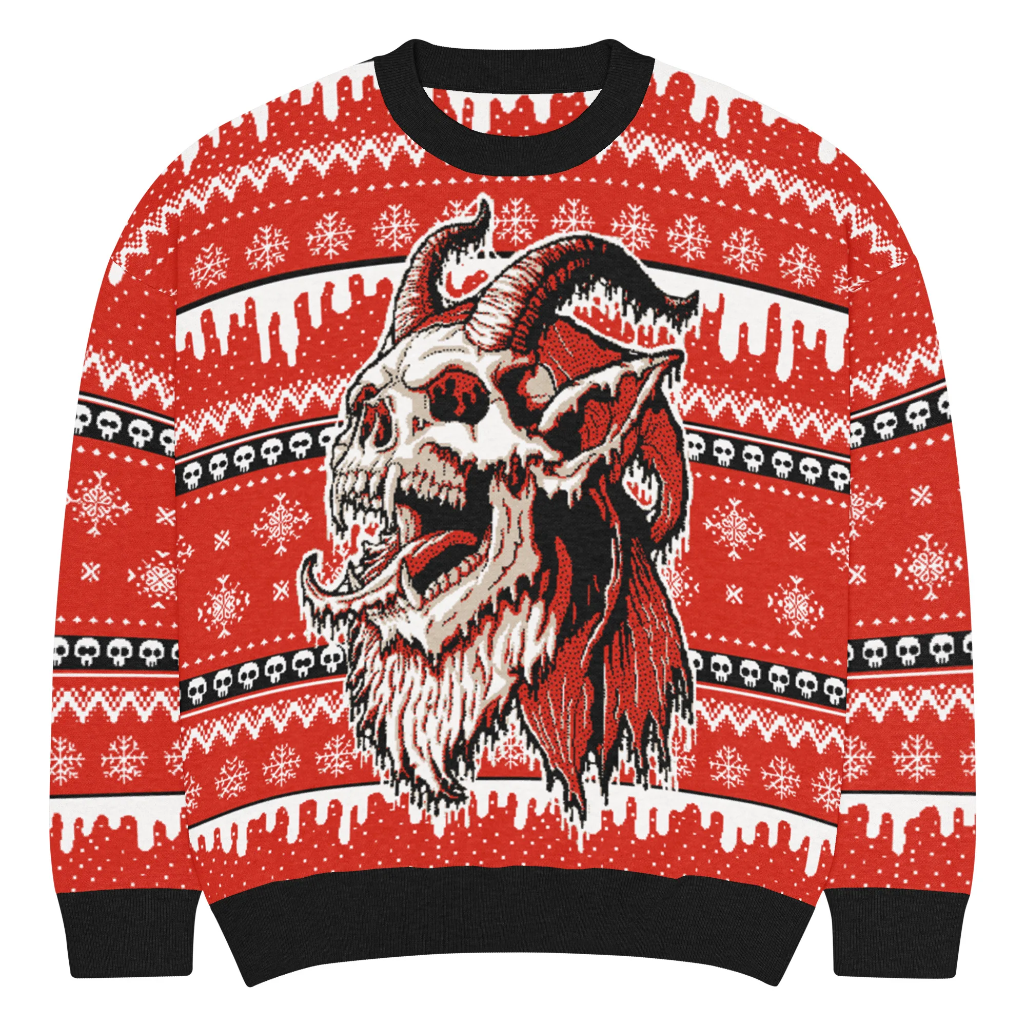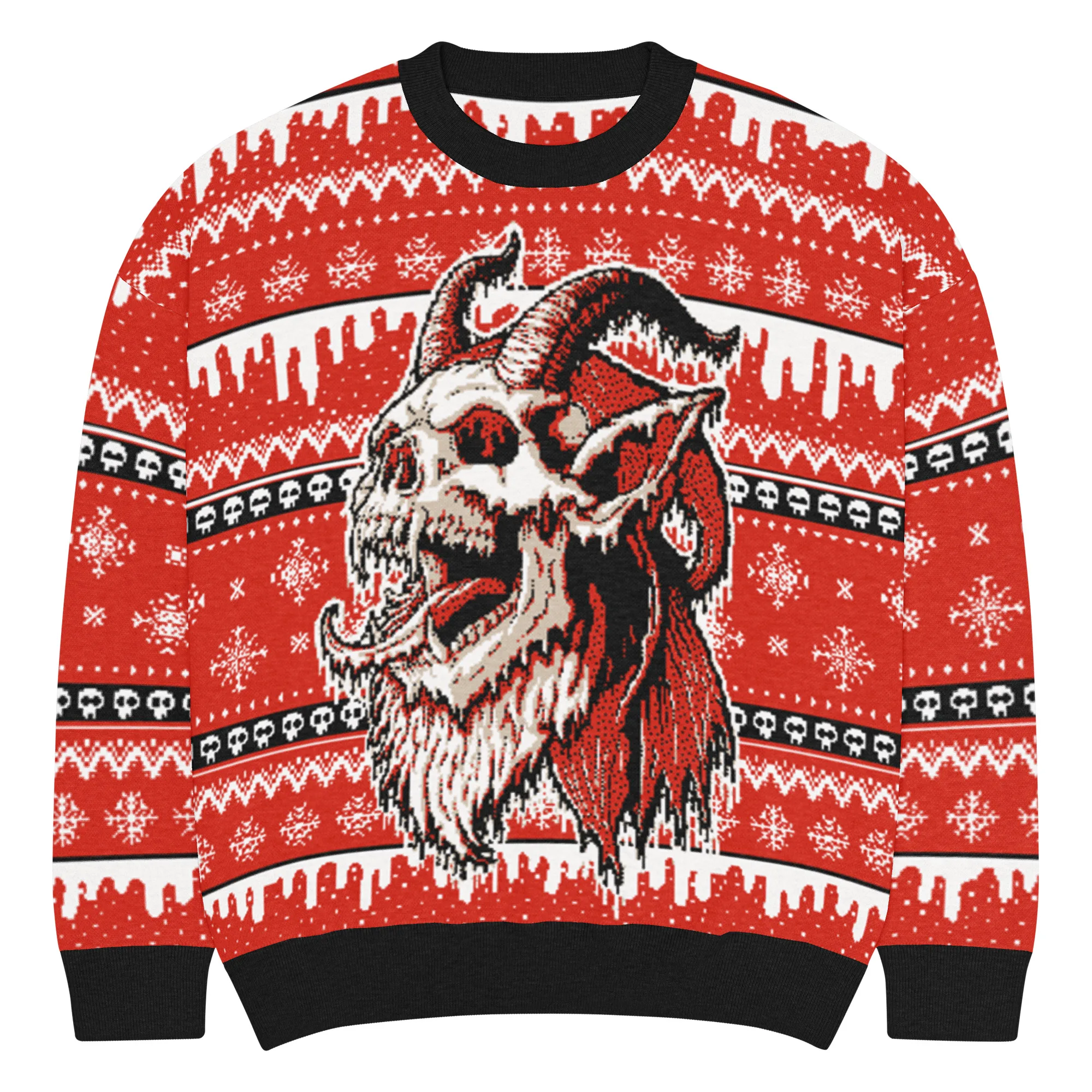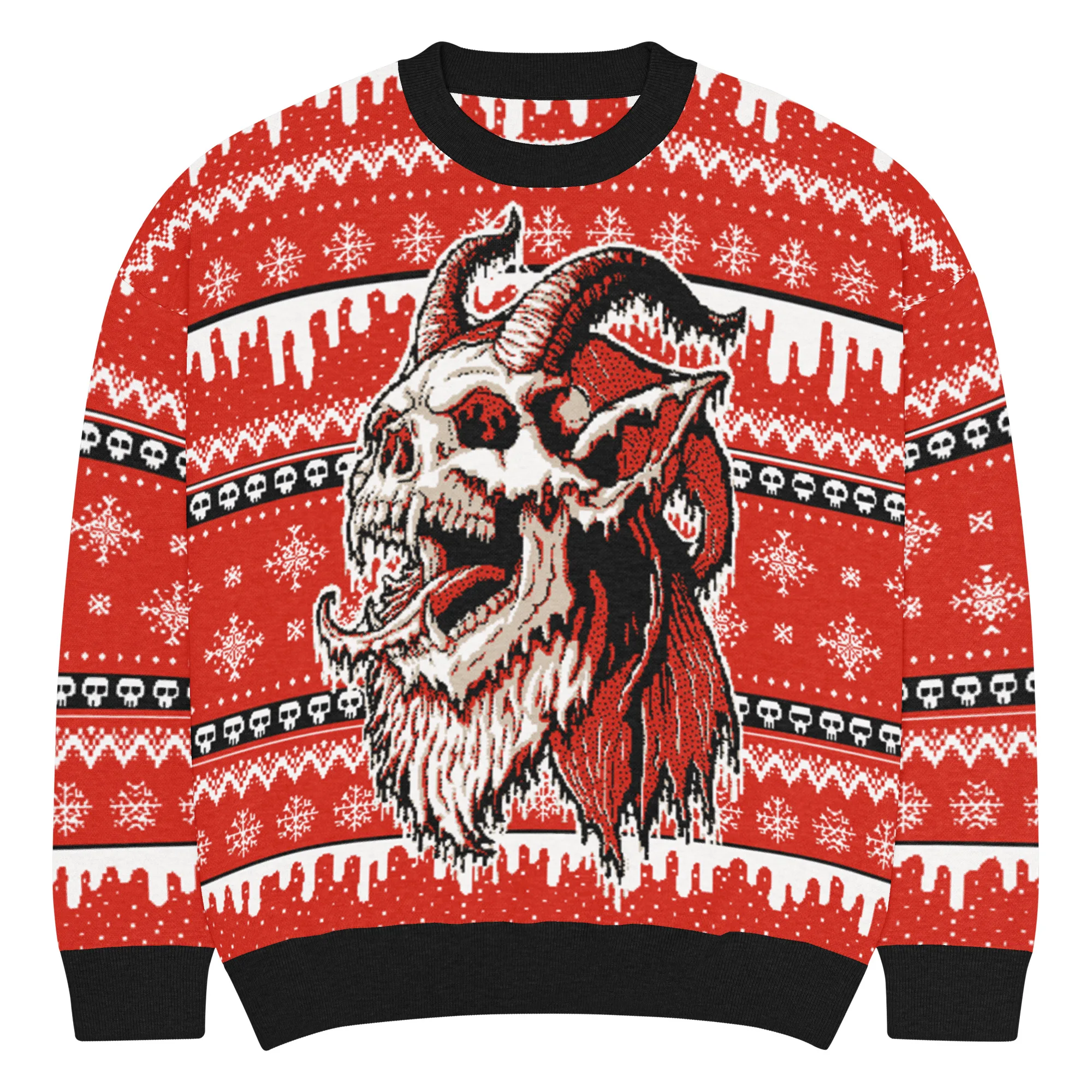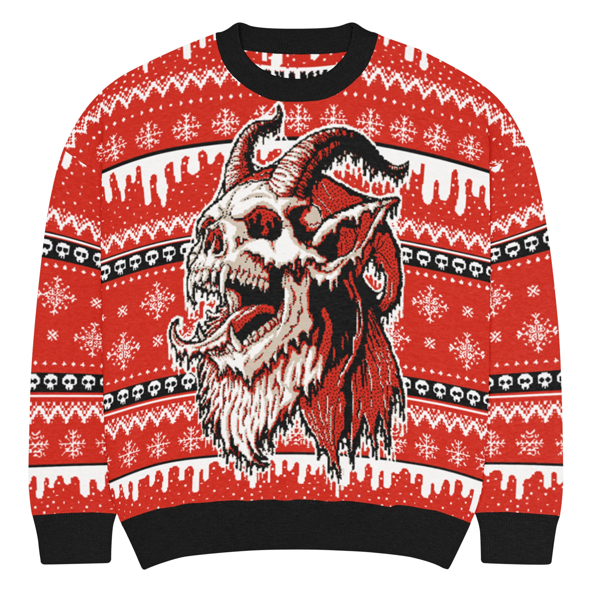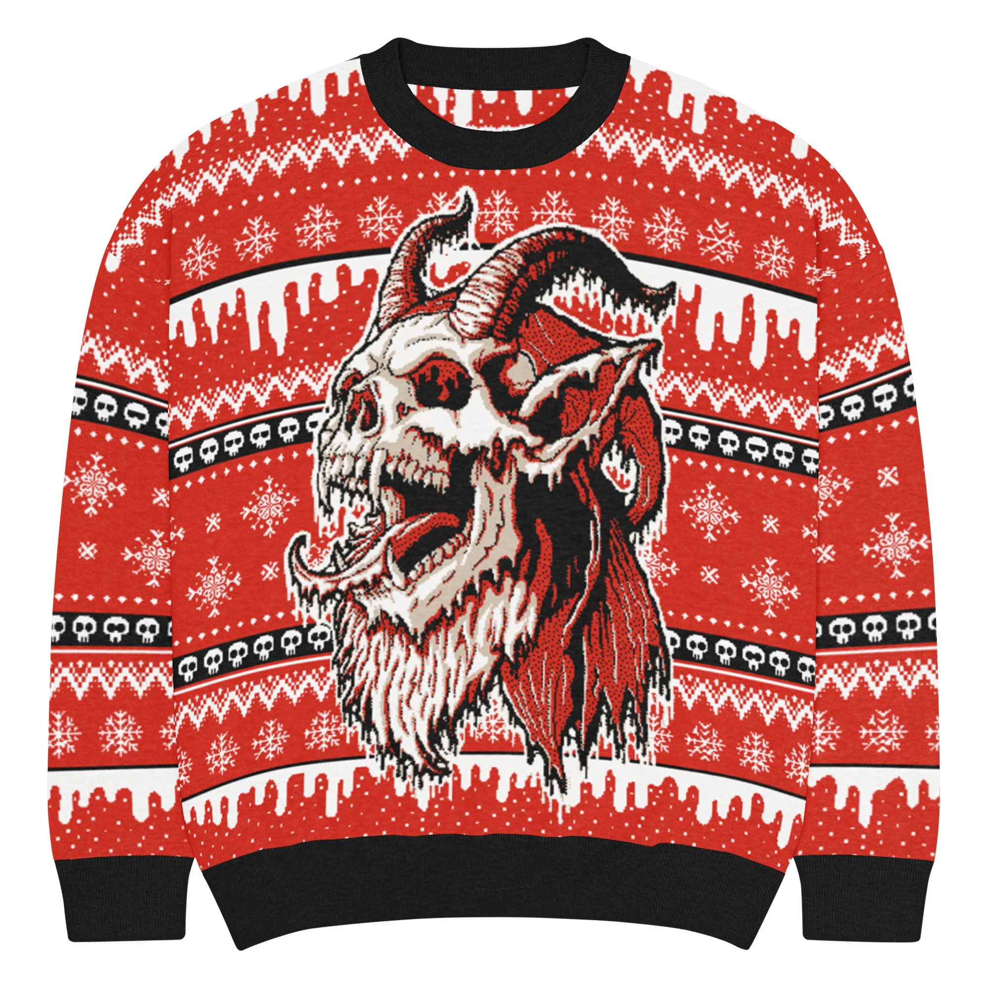 Celebrate the spooky side of the holidays with the Drippy Krampus Knitted Sweater, a gothic winter pullover featuring creepy drippy skull art. Great for horror fans and alternative holiday fashion lovers.