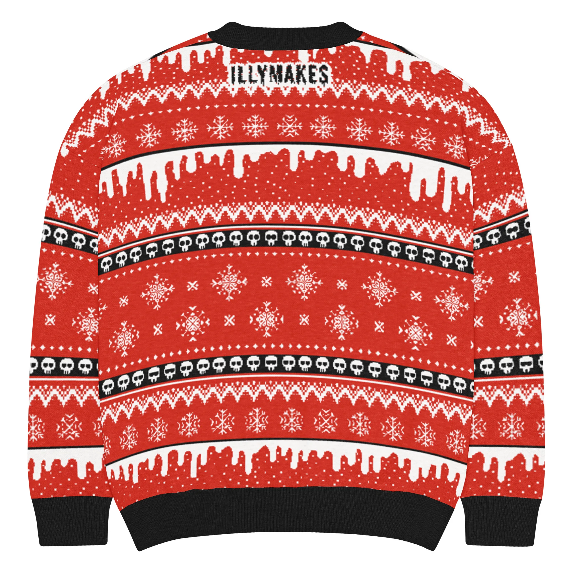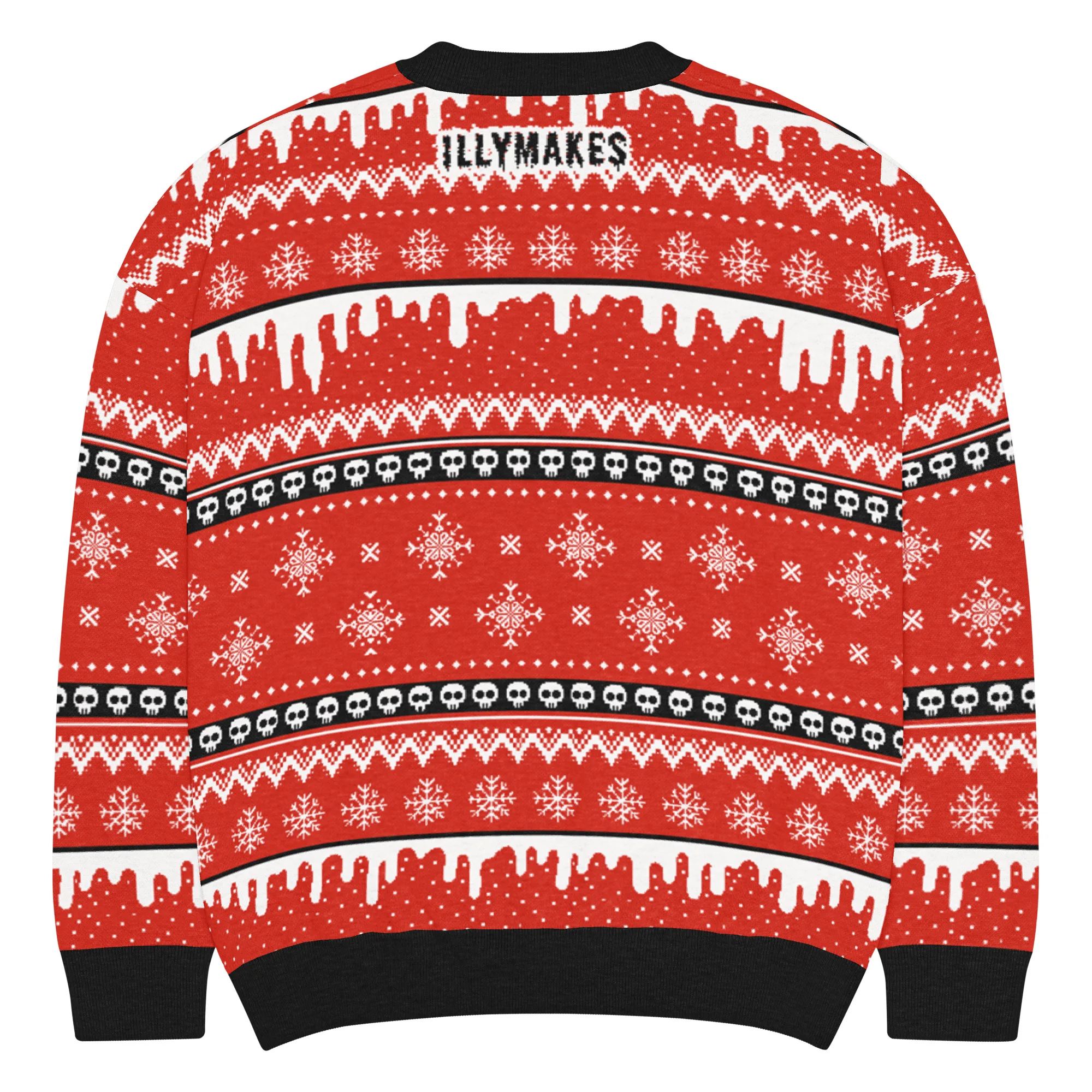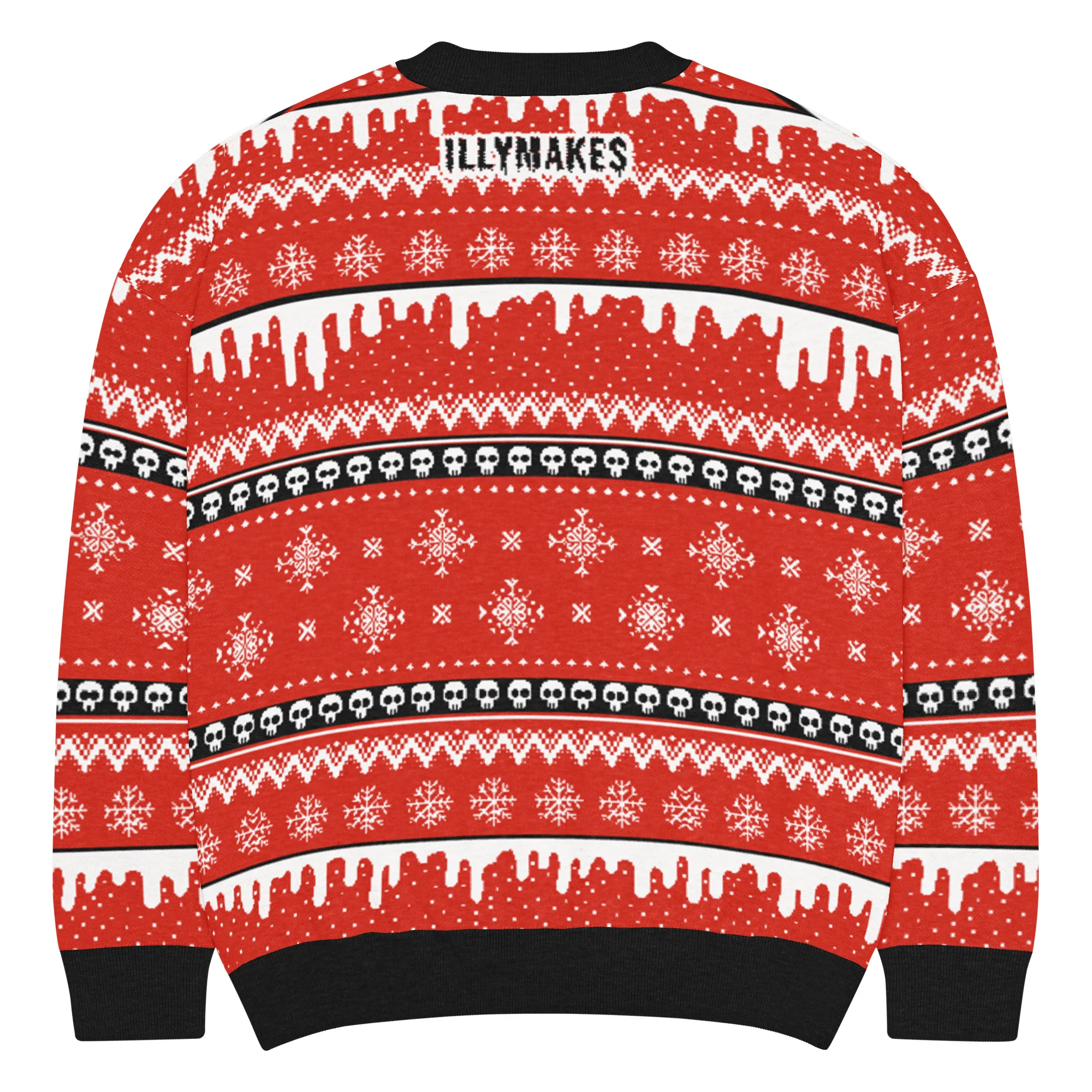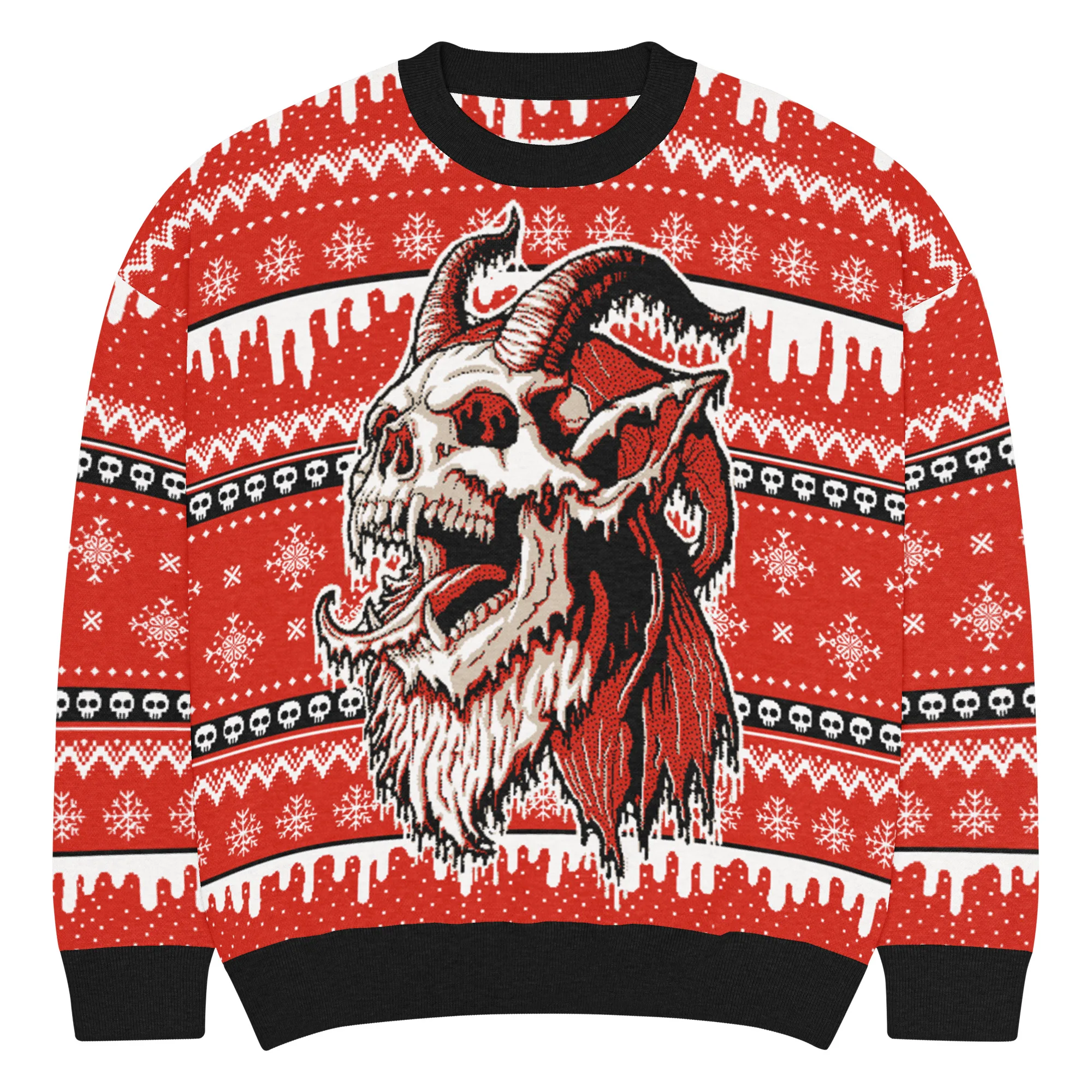 Celebrate the spooky side of the holidays with the Drippy Krampus Knitted Sweater, a gothic winter pullover featuring creepy drippy skull art. Great for horror fans and alternative holiday fashion lovers.