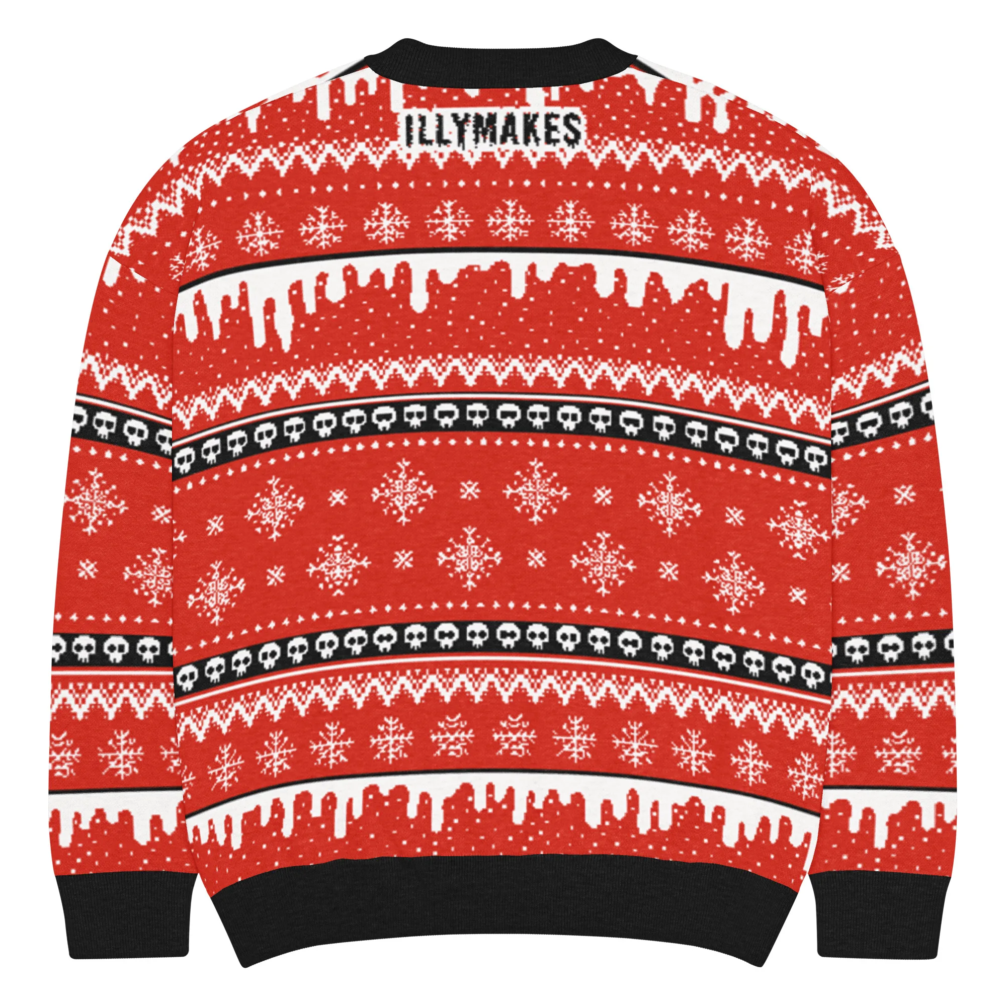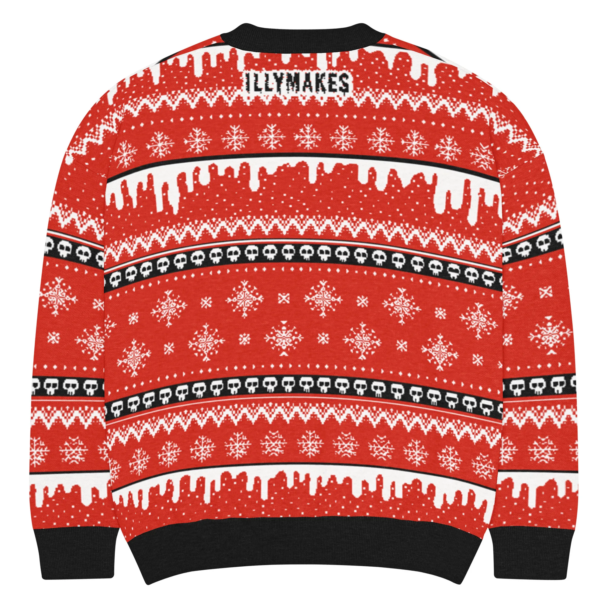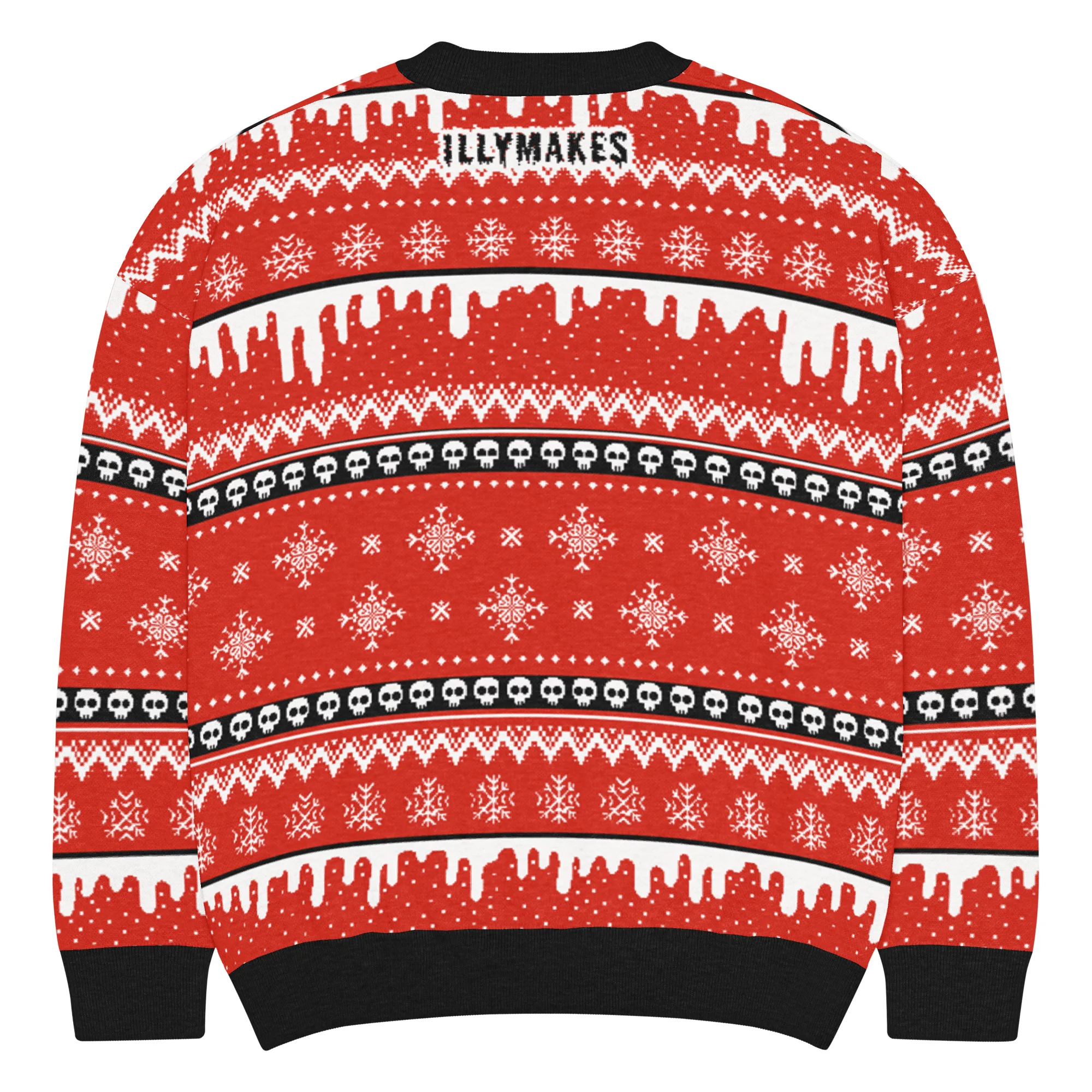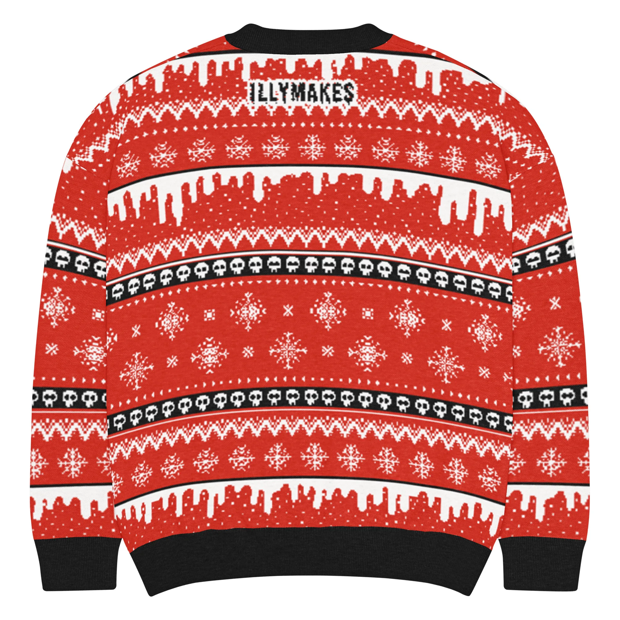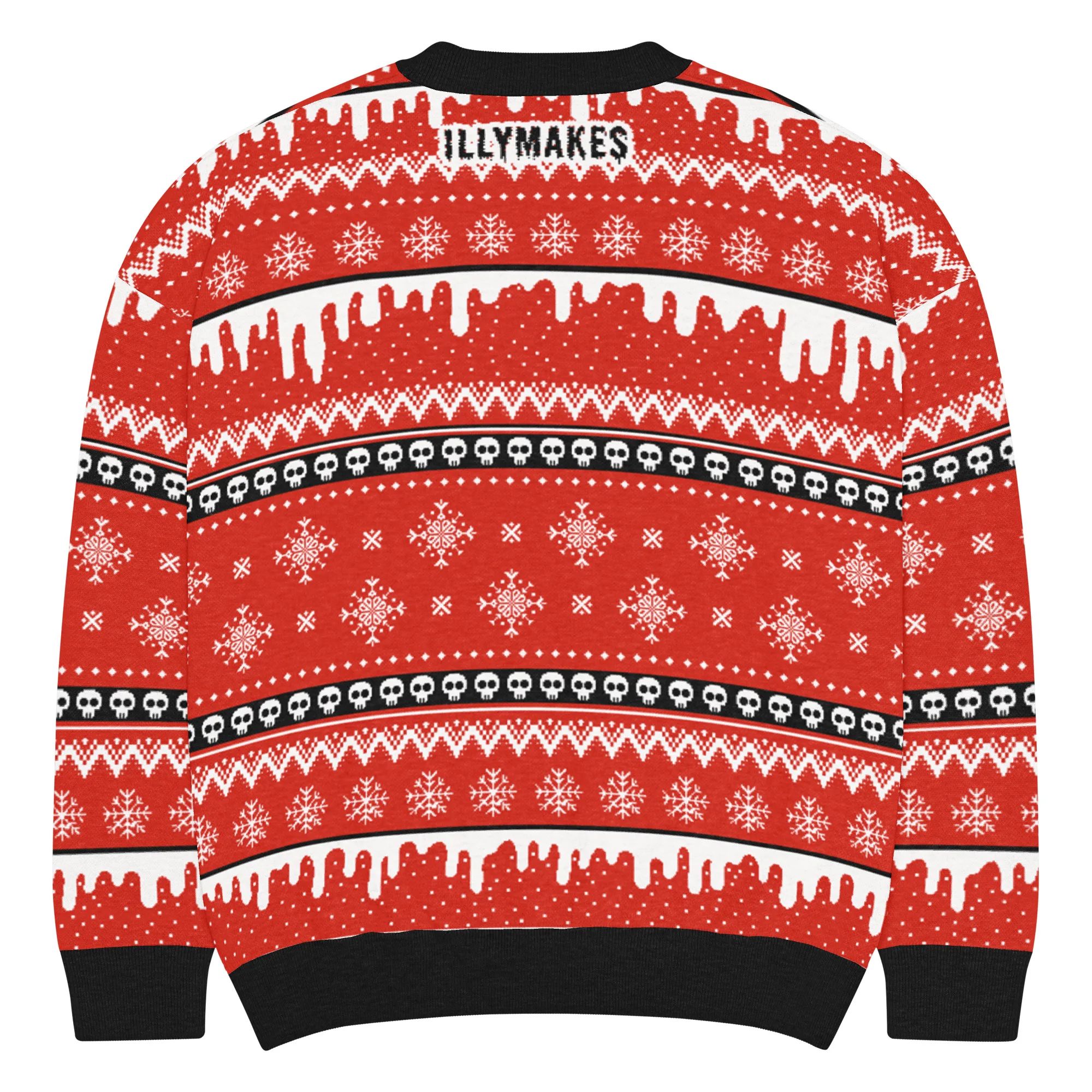 Celebrate the spooky side of the holidays with the Drippy Krampus Knitted Sweater, a gothic winter pullover featuring creepy drippy skull art. Great for horror fans and alternative holiday fashion lovers.