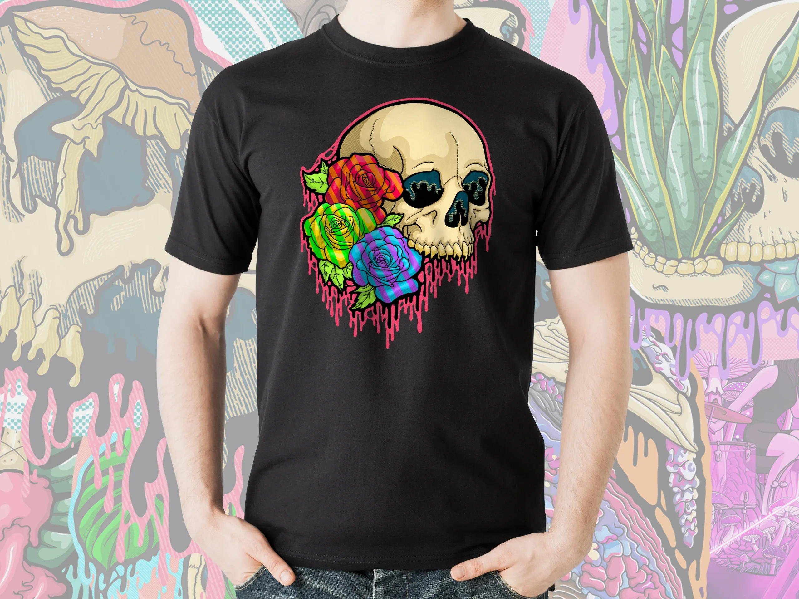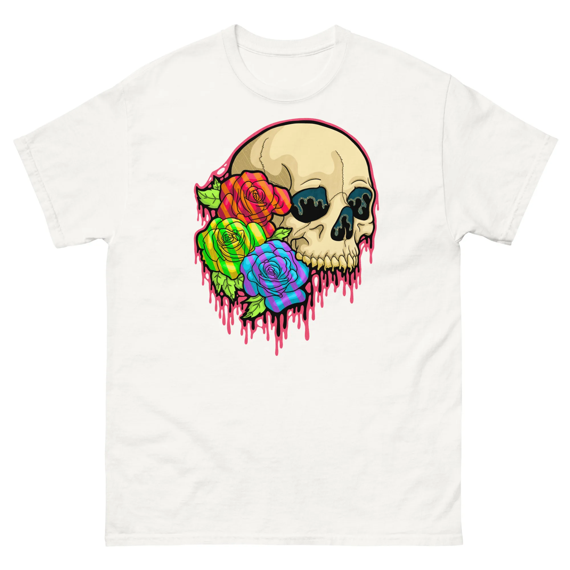 Stand out with the Drippy Pride Skull T-Shirt, a gothic rainbow tee featuring creepy drippy skull art. Perfect for Pride events, alternative fashion, and skull art lovers.