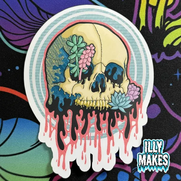 Show off your love for dark botanical horror anywhere with the Drippy Succulent Skull sticker! Featuring a dripping skull wrapped in colorful succulents, this waterproof vinyl sticker is perfect for laptops, water bottles, skateboards, and more.