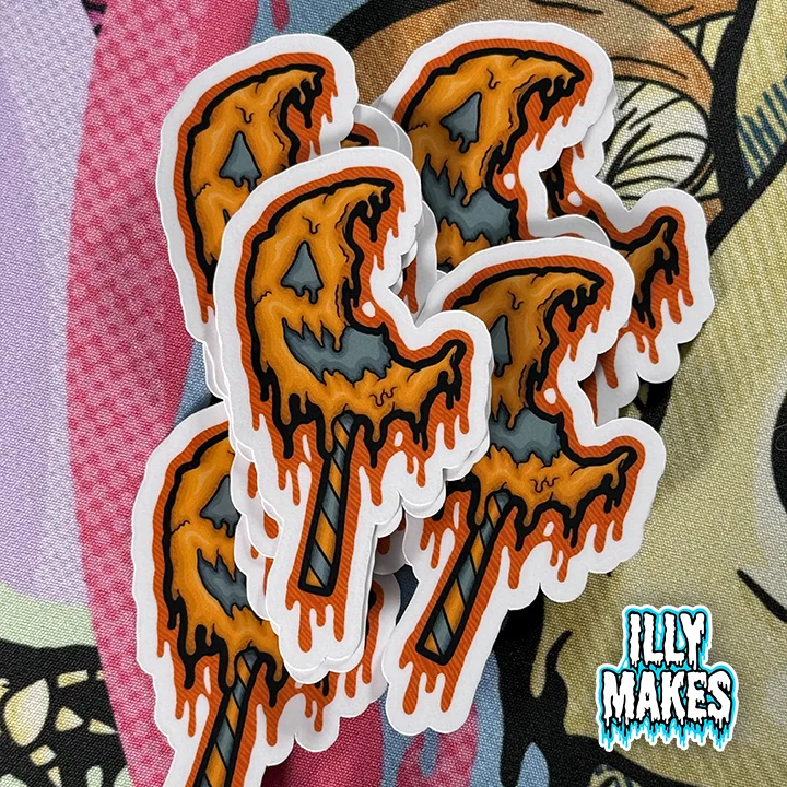 Drippy Trick ’r Treat Sam Lollipop Sticker — original horror art by illymakes. A creepy melting jack-o’-lantern design for Halloween lovers and horror fans.