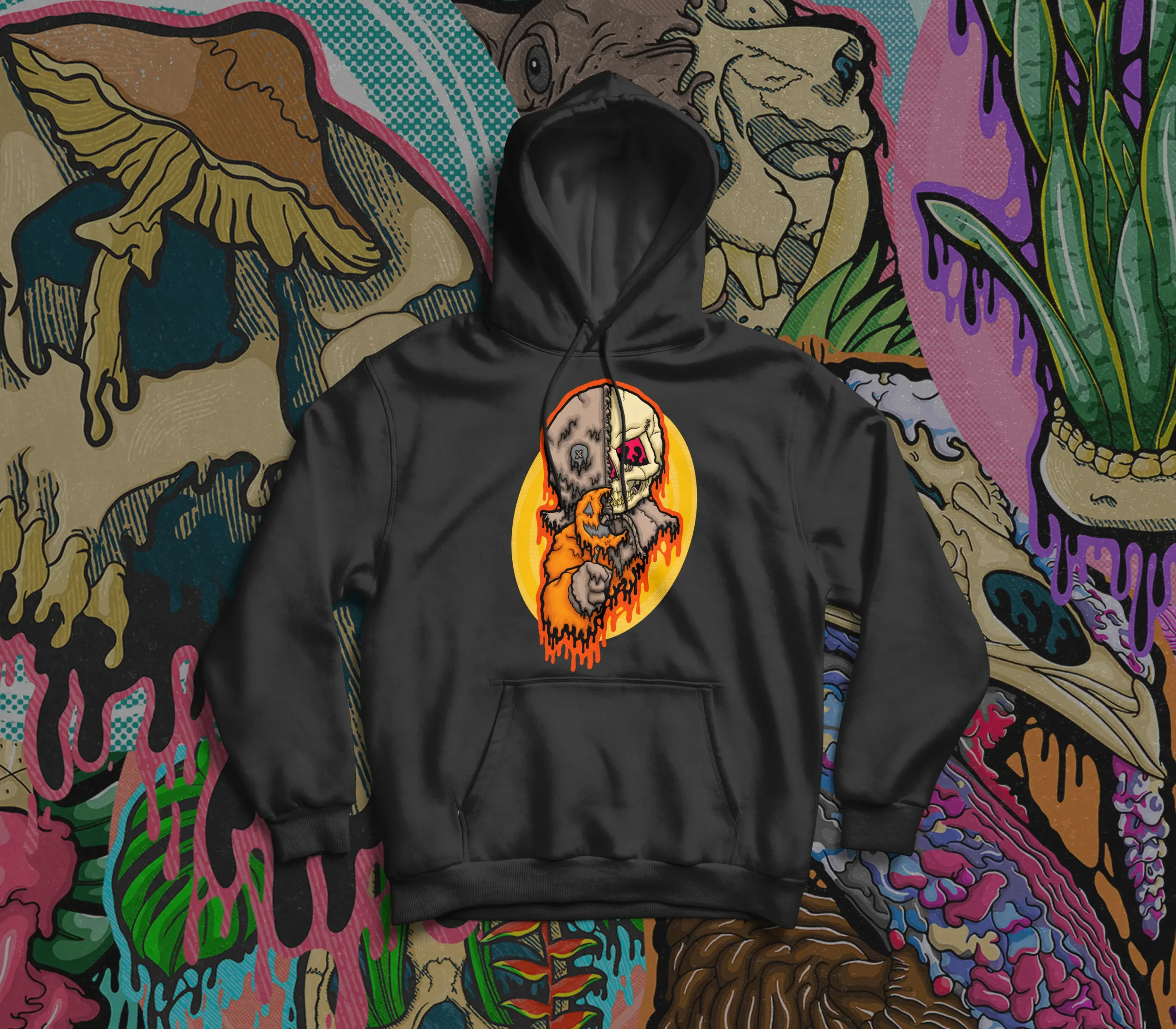 Crafted from organic cotton with a brushed inside for extra warmth, this hoodie is as comfortable as it is eye-catching. Whether you’re bundling up for cooler nights, heading to a fall festival, or just lounging in cozy horror-inspired style, this hoodie delivers both comfort and statement-making art.