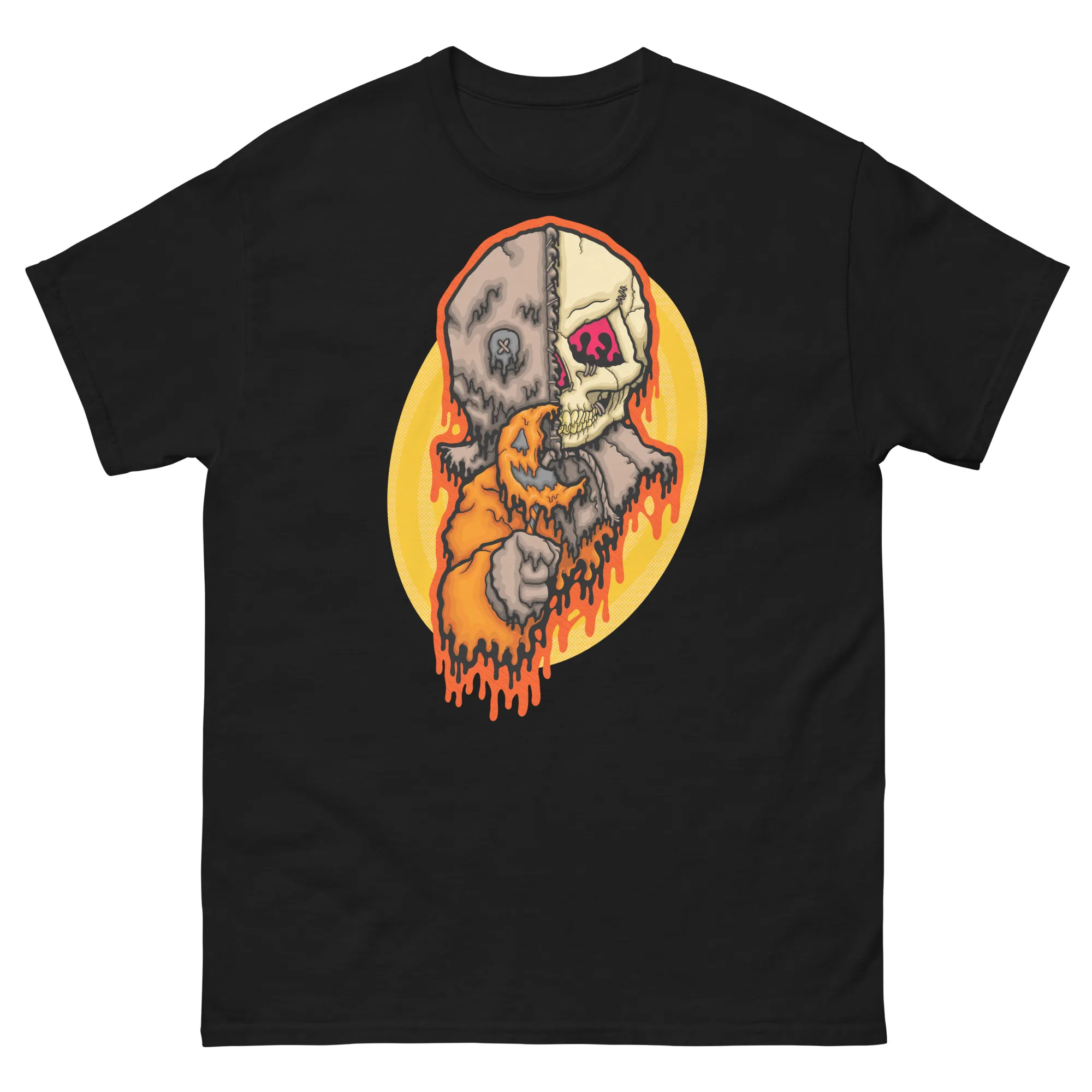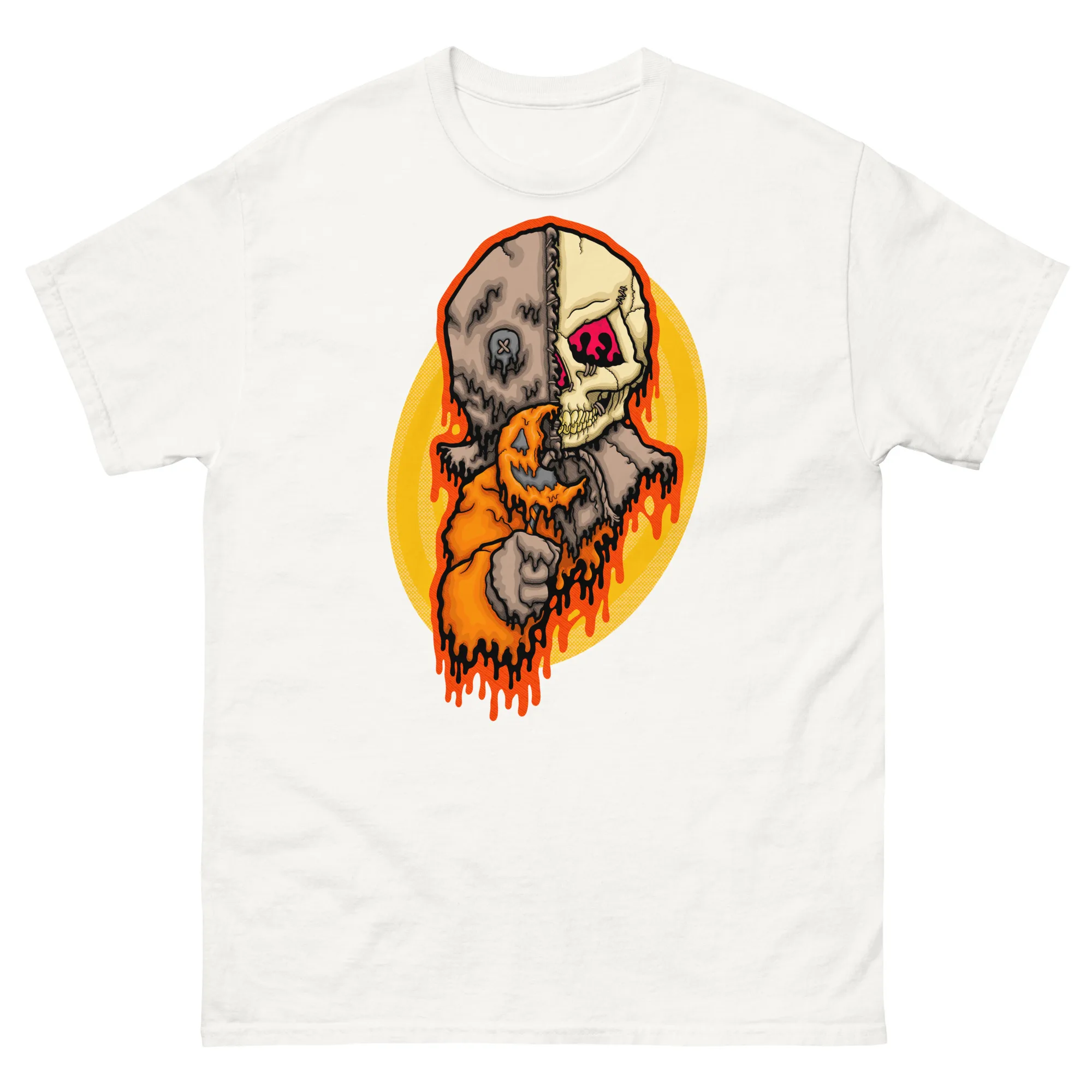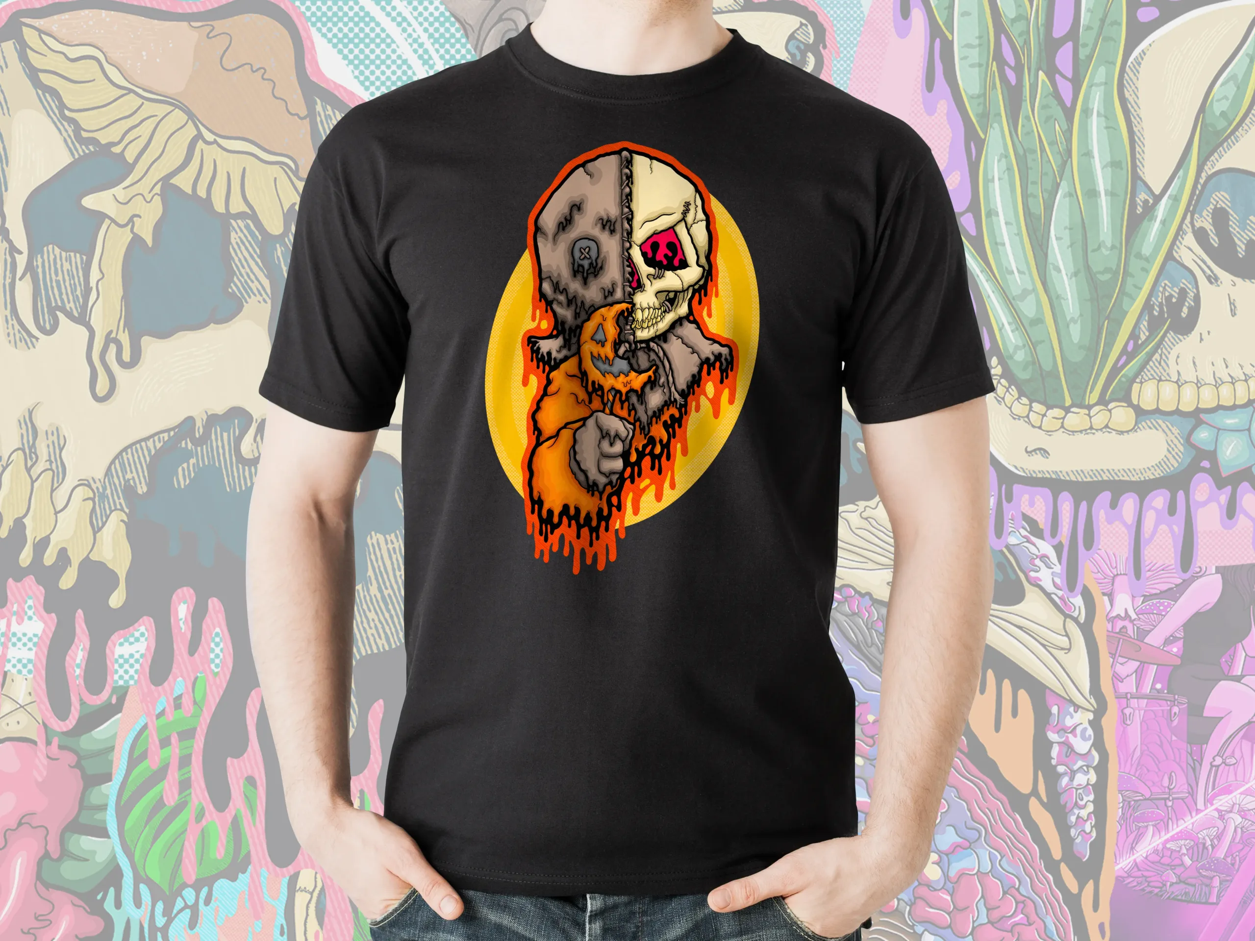 Step into the spirit of Halloween with the Drippy Trick-R-Treat Sam Skull Tee. This original artwork by illymakes reimagines the eerie Sam character with a haunting twist — half burlap-faced trickster, half exposed skull, all dripping in neon horror style. Vibrant shades of orange, yellow, and bone tones melt together in a design that’s both creepy and bold, making it the perfect tee for horror fans, spooky season lovers, or anyone who thrives on dark aesthetic streetwear.