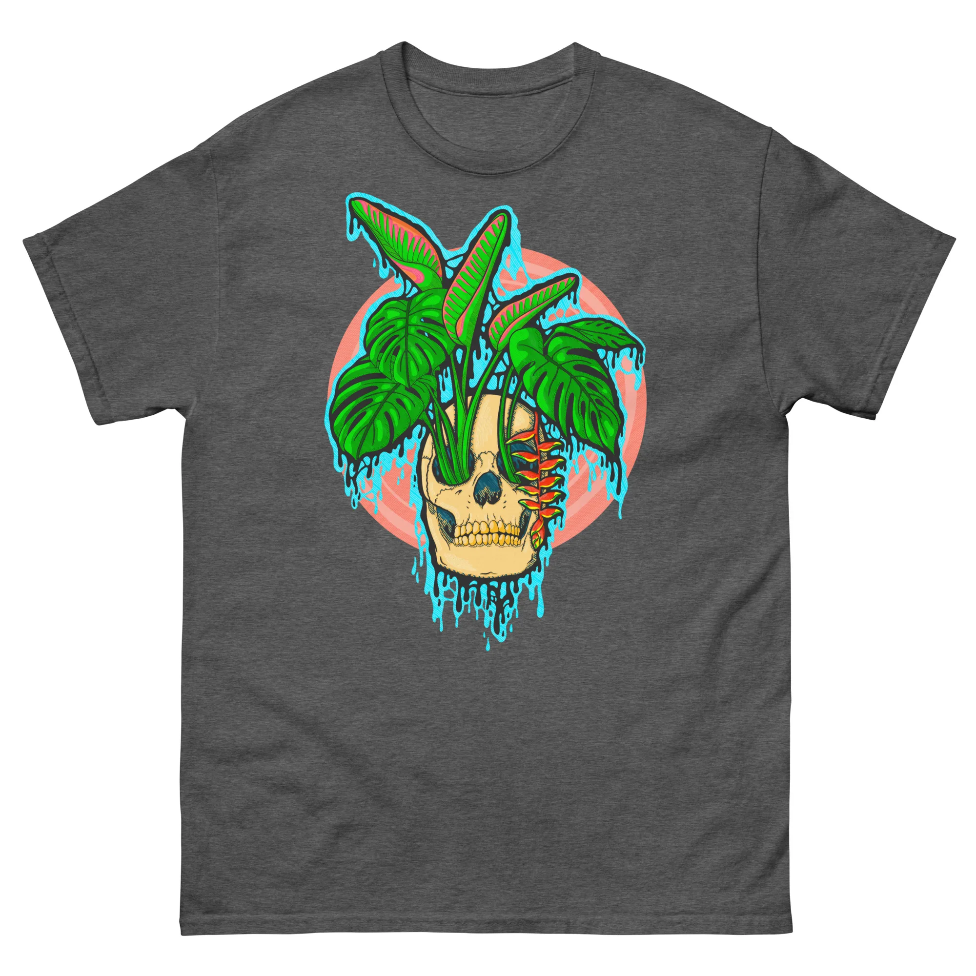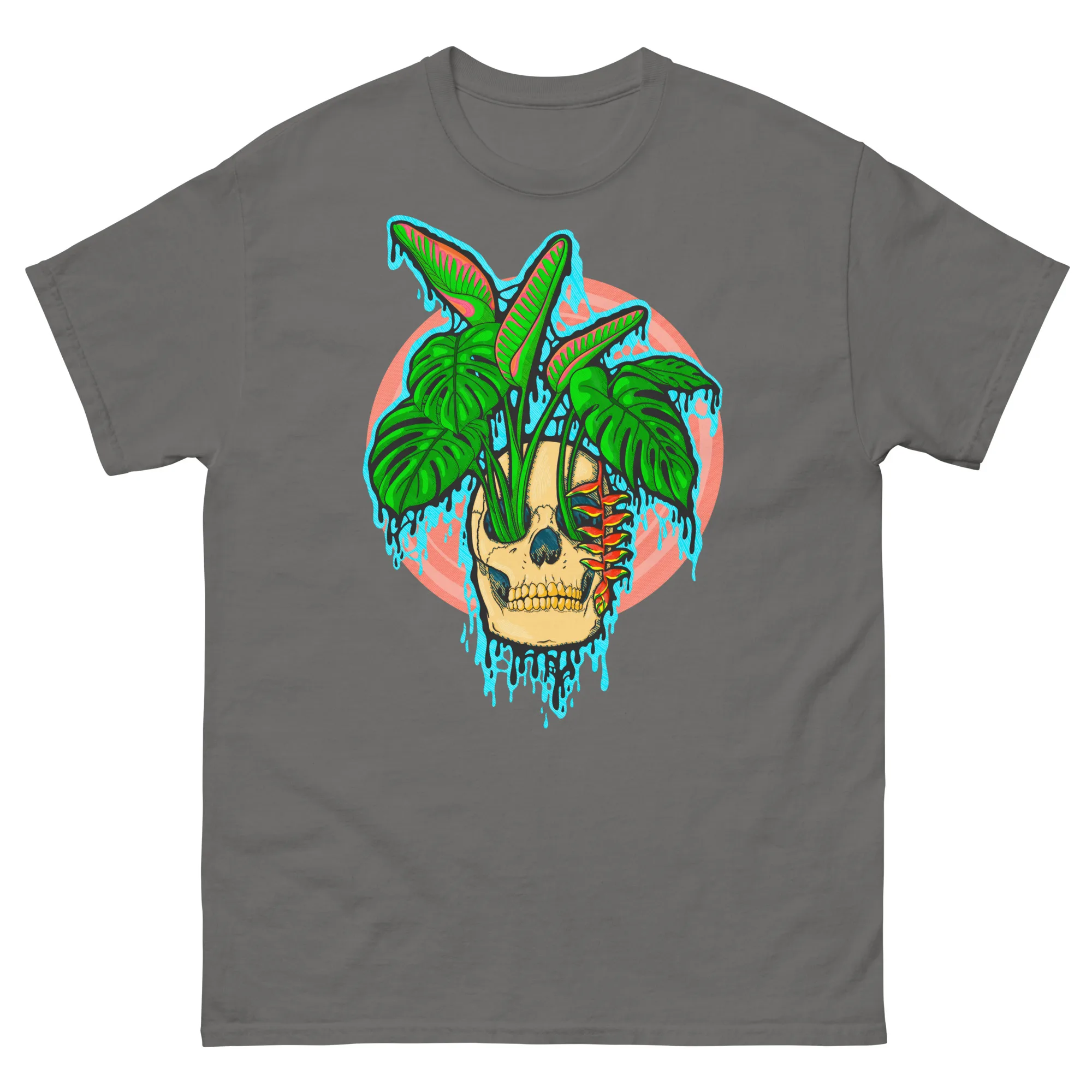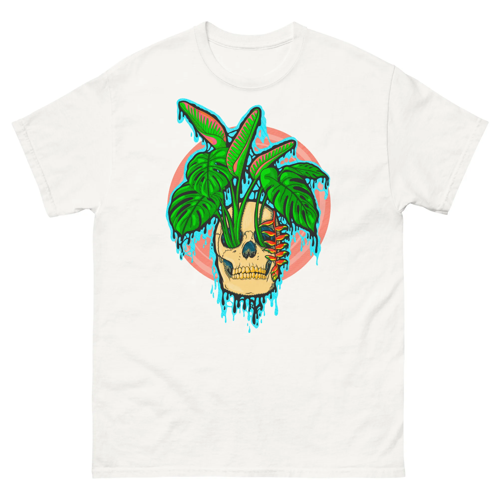 Stand out with the Drippy Tropical Skull Tee, a gothic shirt featuring creepy drippy skull art with tropical flair. Perfect for alternative fashion, macabre design lovers, and spooky streetwear.