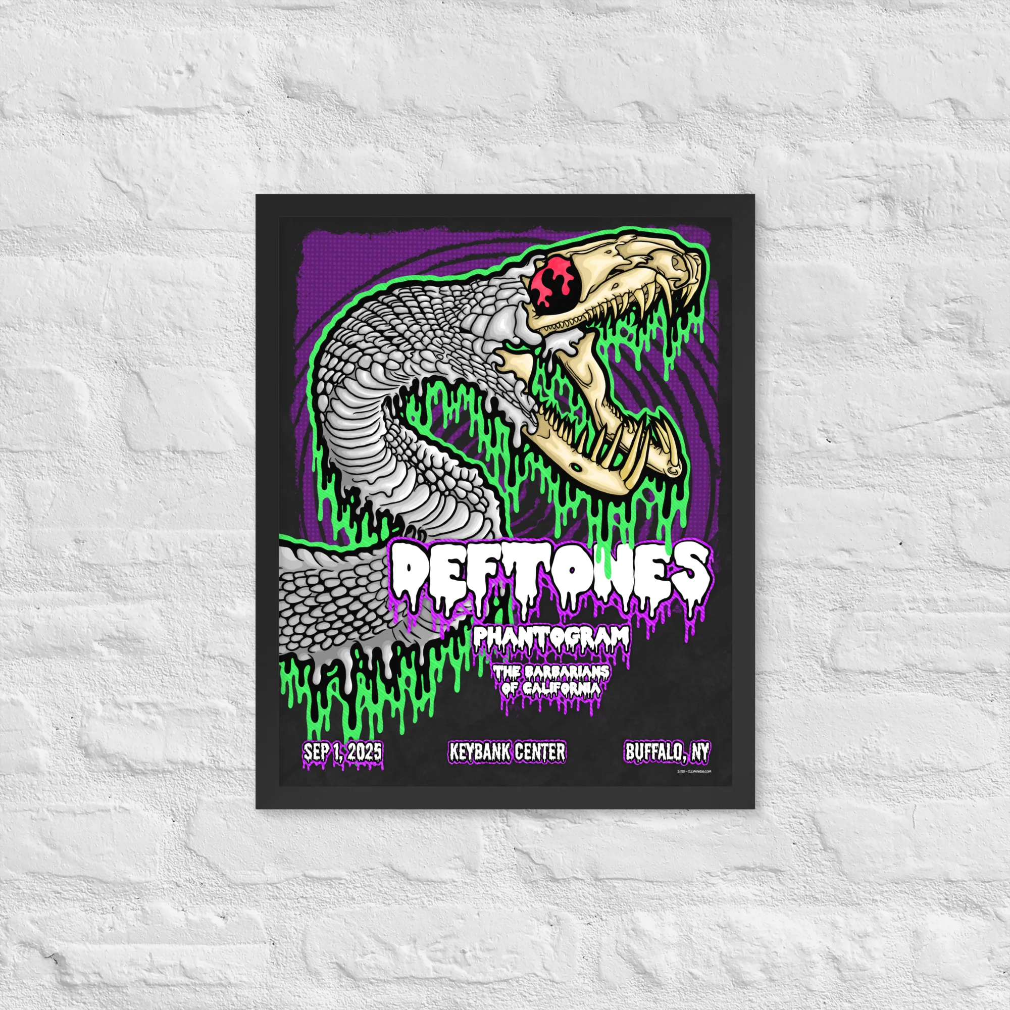 Elevate your walls with the Framed Drippy Deftones Buffalo, NY Fan Concert Poster. This piece reimagines the energy of Deftones’ September 1, 2025 Buffalo, NY show with a snarling serpent skull, neon green drips, and hypnotic purple swirls. Printed on thick matte paper and framed in sleek matte black wood, it’s a bold statement piece that blends concert poster grit with gothic surrealism.